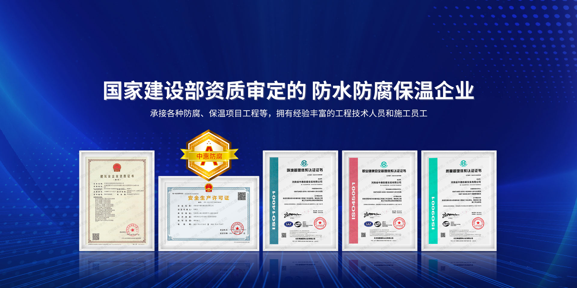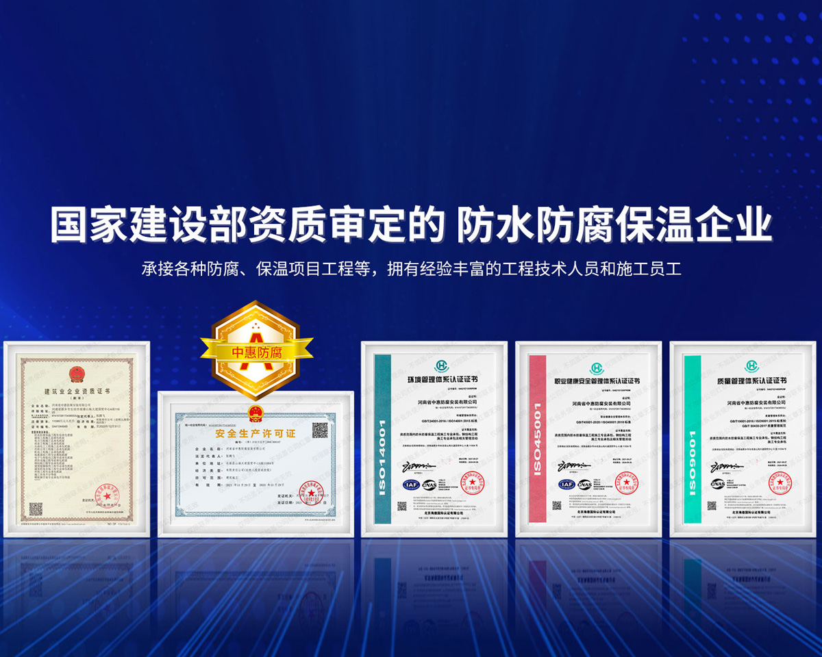 公司經營范圍:防水防腐保溫工程;消防設施工程;建筑裝修裝飾工程;建筑機電安裝工程;電力工程;建筑工程;石油化工工程;工業清洗工程;油罐清洗工程;鋼結構工程;環保工程;模板腳手架工程;電纜防火封堵、防污閃噴涂、外墻外保溫工程;各類施工勞務作業;設備維修、船舶鉚焊、涂裝;電力工程材料、建材、防水材料、防火材料、防腐保溫材料銷售,并相繼通過了GB/T19001-2008idtISO9001:2008GB/T50430-2007質量管理體系認證證書。GB/T24001-2004idtISO14001:2004環境管理體系認證證書。GB/T28001-2011idtOHSAS18001:2007職業健康安全管理體系認證證書。公司是中國防腐蝕于防護協會、中國施工企業管理協會、電力協會和中國鋼結構防水協會會員單位。 公司的經營業務涵蓋了石油、化工、電力、冶金、煤炭、船舶、國防、燃氣、水利、環保、交通運輸、航空及國防軍工和輕紡市政等行業的防腐保溫絕熱設備。鋼結構安裝、防火、防水、金屬噴鍍、聚脲噴繪、陰極保護、防滲透堵漏、玻璃鋼及各種磚版材料襯里、橡膠襯里、煙氣硫和耐酸溶劑腐蝕等工程施工。公司連續十年榮獲“省市先進施工企業”“安全生產先進單位”“重合同,守信用企業”和“AA***資質企業”的稱號。2000年被命名為市級文明單位,2002年被國家工商行政管理局命名為“重合同,守信用的企業”、被中國工業防腐蝕技術協會命名為“防腐蝕企業,能源節約及環境保護領域有豐富的經驗和***的業績。工程一次交驗合格率100%。其中攀枝花鋼鐵公司煉鐵廠四號高爐及熱風爐防腐工程、上海寶鋼公司煤氣柜防腐工程、撫順石油一廠裝置防腐項目、齊魯石化公司稀烴廠高塔防腐工程、吉林化學工業公司煉油廠油罐防腐工程、天津石化熱電廠六號爐頂棚聯絡管保溫工程、大慶油田(太倉)力神泵業工程、中國化學工程第十一建設工程、中原油田勘探局工程、中國石化銷售有限公司華北分部、魯皖輸油管道工程、貴州開磷息烽合成氨工程、陜西黃陵煤化工程、中國石油天然氣西部管道塔里木輸油工程、邯鋼集團邯寶鋼鐵公司煉鐵工程、德州供電工程、吉寶(南通)船廠工程,偃師華潤熱力工程、鄭州熱力總公司。 河南省中惠防腐安裝有限公司愿以豐富的施工經驗,***的技術,***的設備,***的管理,***的服務,竭誠為國內外廣大的用戶提供***滿意、******的工程作品。 我公司愿與國內外同仁一道,團結協作,共同推進防腐蝕行業發展! 公司地址:河南省長垣縣建設路北段360號 固定電話:0373-8866488 郵編:453400 網址:http://www_zhff_com_cn.dachuansmokeset.com